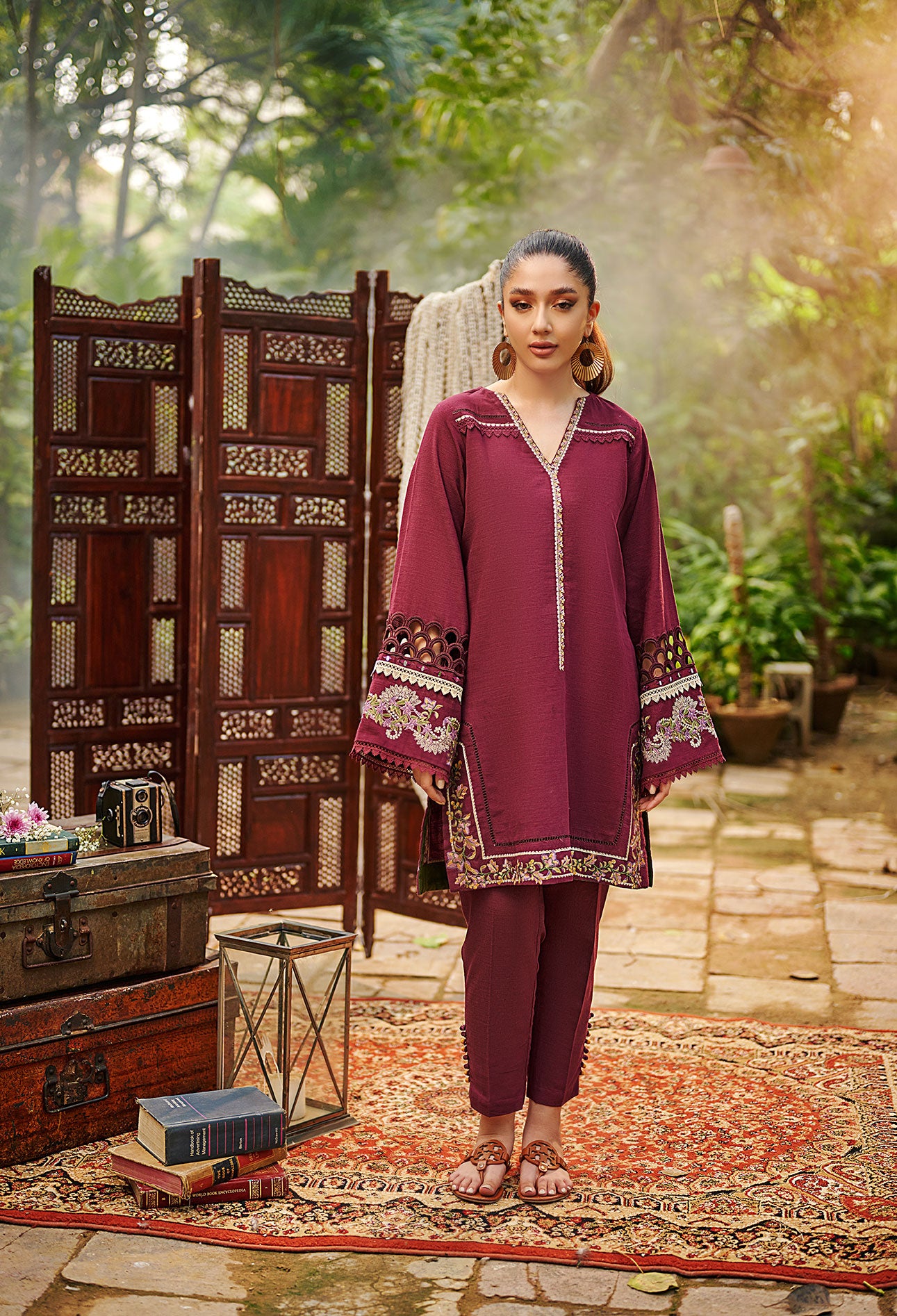 DC 2024 BURGUNDY 2PCS EMBROIDERED KURTA WITH TROUSER โ Dhanak.com.pk